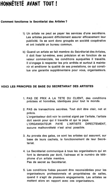 Pour nous permettre de vous renseigner efficacement, veuillez lorsque vous nous téléphonez, nous donner chaque fois les renseignements précis qui suivent : lieu, date et heure de passage souhaité - Préciser s'il s'agit d'une salle, d'un chapiteau - Nous confirmer que vous vous chargez de fournir un matériel d'amplification en parfait état et un éclairage comprenant des projecteurs - Nous donner les noms des vedettes qui vous intéressent.