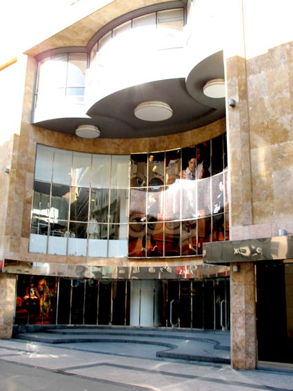 La façade de ce chef-d'œuvre moderniste déploie un monumental hall vitré en demi-cercle sur quatre niveaux, entouré de larges pilastres et d'un entablement en marbre ocre.