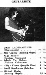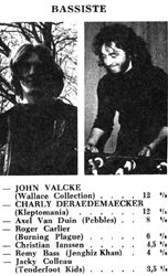 J.M. : Cette même année, Piero organise un grand référendum dans l'hebdomadaire Télé Moustique : le Pop Poll 70. Kleptomania occupe la première place et recueille 44% des suffrages. Votre disque est classé en tête. Plébiscite également pour Dany Lademacher sacré meilleur guitariste, Roger Wollaert, meilleur batteur, et toi meilleur bassiste en ex-æquo avec John Valcke. Ca ne vous a pas donné la grosse tête ? |