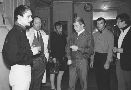 The Mec-Op Singers - Janvier 1967 - Tournage clip Dies Irae à la RTB (1) André Thérasse, Lucky Streel, Freddy Evrard, David Dandoy, Michel Sterkendries (à l’avant-plan).